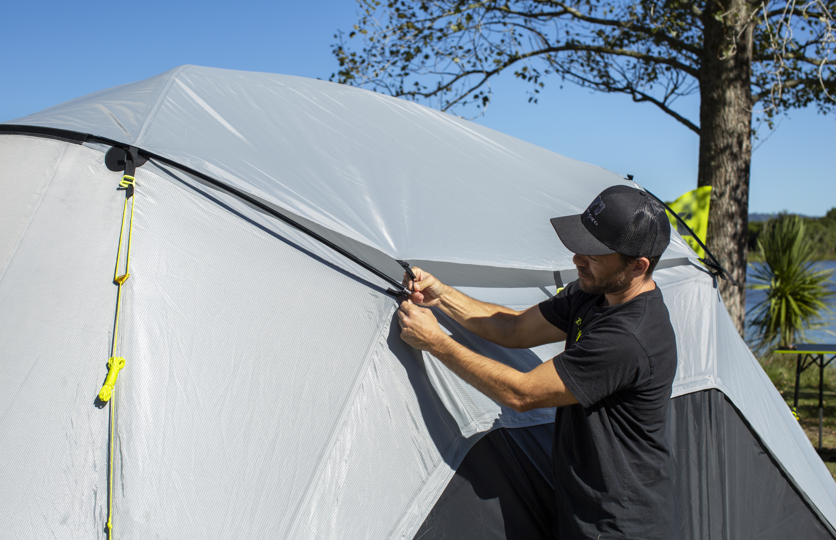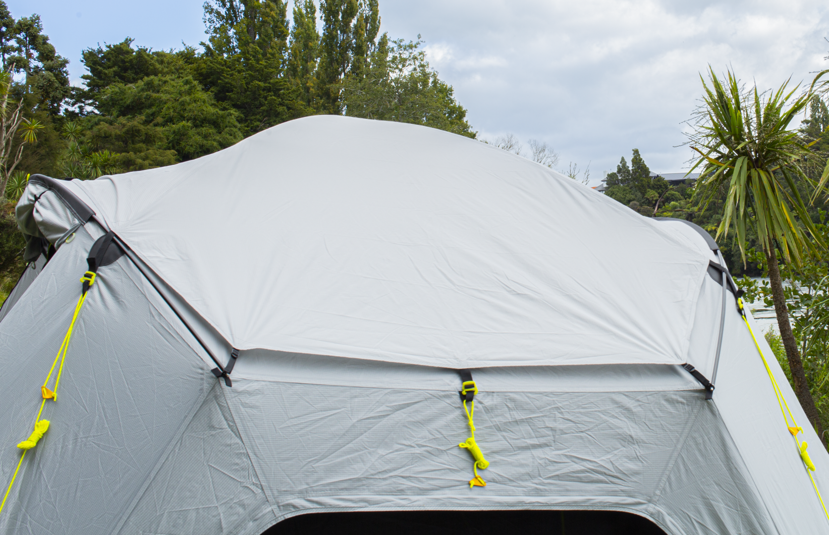 Der Hitzeschutz wird einfach und rasch am Alu-Gestänge des Aerospeed Zelts befestigt und reduziert die Temperatur im Zelt an heißen Tagen. Zusätzlich schützt er das Zeltdach (Roof Cover) vor Verschmutzung wie Vogeldreck und Baumharz: