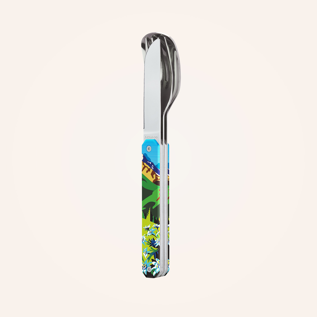 Praktisches Besteckset im coolen Design "Bergsommer": Sehnsucht nach frischer Luft? Die Berglandschaft am magnetisches Akinod-Besteckset ist ebenso außergewöhnlich wie erholsam! Einfach zu transportieren, begleitet es bei täglichen Abenteuern, ob urban oder in Kiefernwäldern!