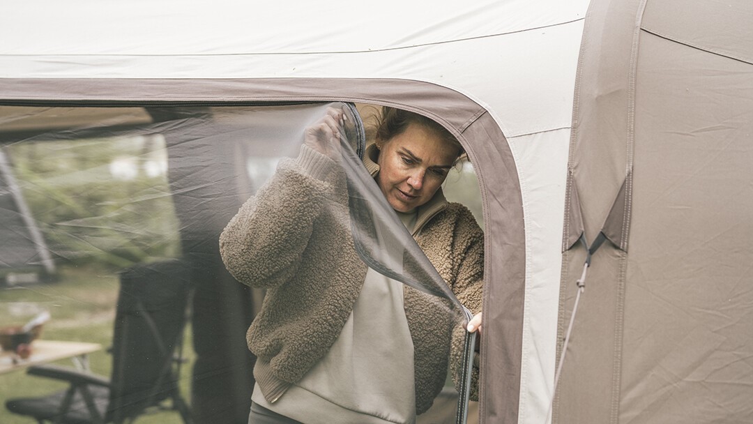 - Zip-up Vorhang mit cleveren Reißverschlusssystem, das sich flexibel öffnen und schließen lässt, je nachdem wie viel Tageslicht im Zelt gewünscht wird