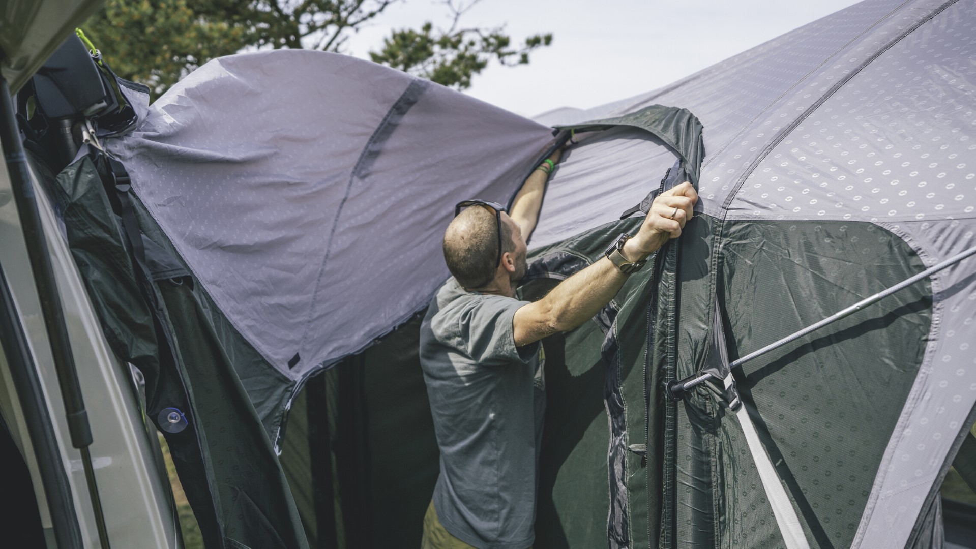 - Drive Away Ready System: einfache Möglichkeit, ein freistehendes Busvorzelt an einem Fahrzeug anzuschließen und zu trennen, ohne dass ein Adapter-Set erforderlich ist. Am Zelt ist dazu die Schleuse mit Reißverschluss angebracht.