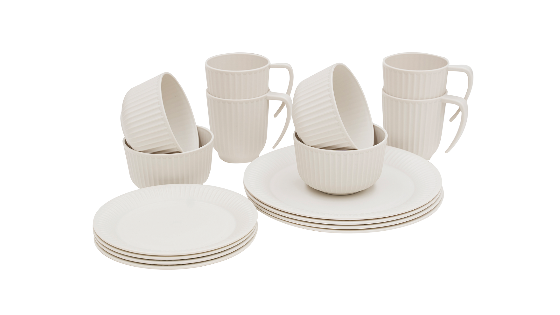 16 teiliges Geschirr-Set für 4 Personen in eleganter Sandsteinfarbe, bestehend aus je 4 Esstellern, Desserttellern, Tassen und Schalen.