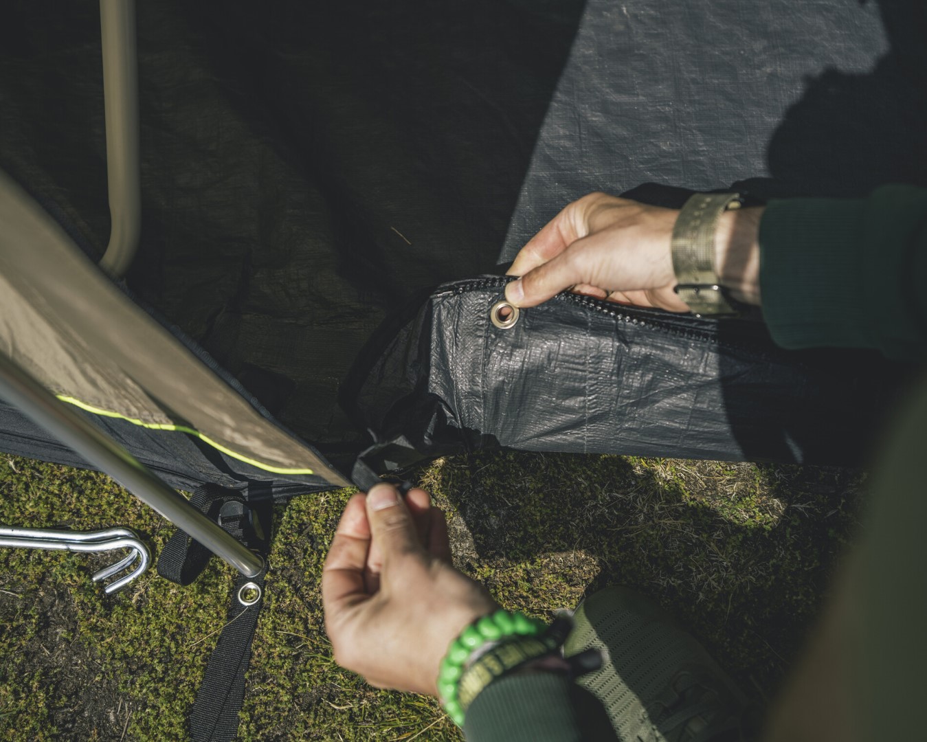 - Zip-up Vorhang mit cleverem Reißverschlusssystem, das sich flexibel öffnen und schließen lässt, je nachdem wie viel Tageslicht im Zelt gewünscht wird