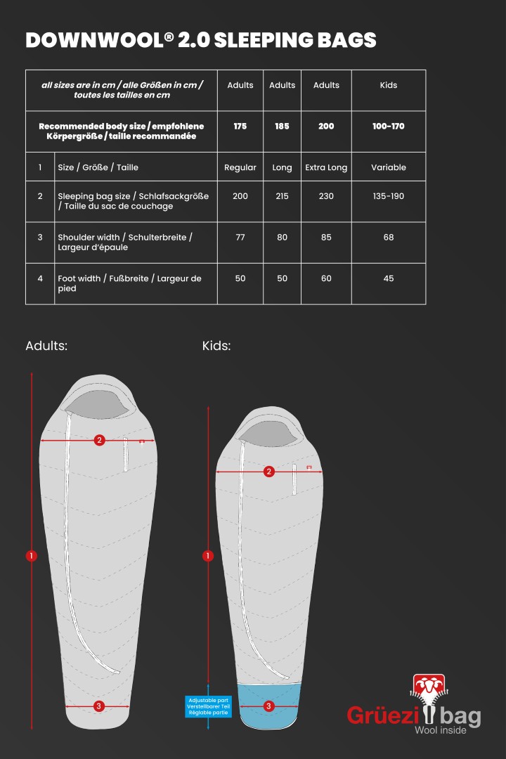 - Komfortabler Schnitt – mehr Bewegungsfreiheit, weniger Kälte: Für erholsamen Schlaf braucht der Körper Bewegungsfreiheit. Der ergonomische Schnitt der DownWool®-Schlafsäcke bietet genau das: Platz für Schlafpositionen wie Seitenlage oder für Drehen, selbst in Mumienform. Die etwas großzügigere Passform verhindert Kältebrücken, da die Füllung nicht komprimiert wird – für durchgehend angenehme Wärme und maximalen Schlafkomfort.