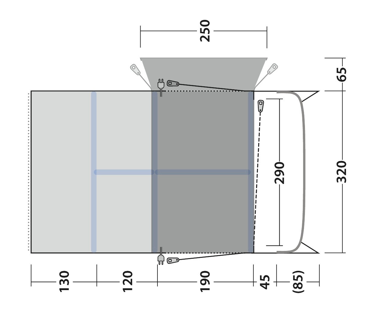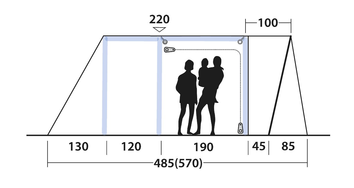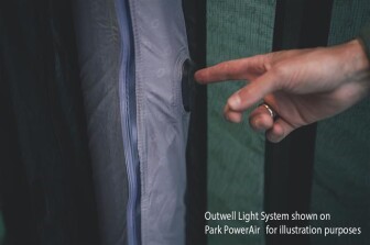 - Outwell Light System: integriertes Licht am Bogen, welches mit USB-C Anschluss durch jede beliebige Powerbank (nicht inkludiert) betrieben werden kann.