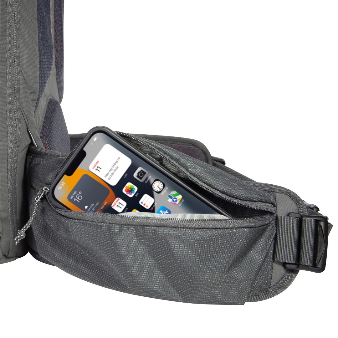 - Abnehmbarer, gepolsterter Hüftgurt mit Materialschlaufe rechts und Reißverschlusstasche links