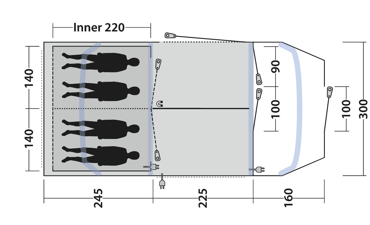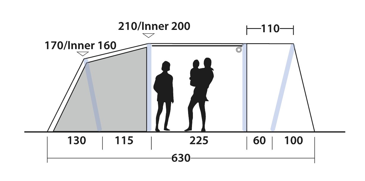 | Innenzeltmaterial: | 100% atmungsaktives Polyester, verdunkelte Premier Bedrooms |