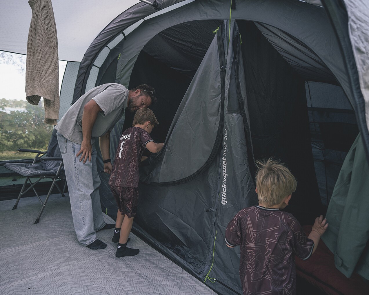 - Outwell Easy Access System: Haupttüre öffnet zur Seite, Boden lässt sich eben auslegen, sodass ein sicherer Zugang ohne Stolperfalle gegeben ist