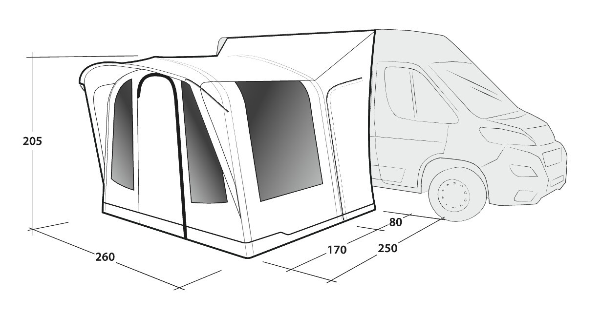 Das Santa Monica Air Mid/Tall ist das perfekte Drive-Away-Vorzelt für alle, die mit höheren Fahrzeugen wie Fiat Ducato, VW Crafter, Mercedes Sprinter oder ähnlichen Modellen unterwegs sind. Die Ausmaße dieses Anbauzeltes sind kompakt und so abgestimmt, dass es einen feinen zusätzlichen Wohnraum, aber auch eine praktische Schlafmöglichkeit für Paare, kleine Familien oder Alleinreisende bietet. Die großen getönten Folienfenster lassen angenehm weiches Licht ins Zeltinnere und sorgen für eine gute Atmosphäre. Der Zugang über die beiden seitlichen Eingänge in der Link Acess Zone ist außerordentlich bequem und flexibel. Die Vordertüre ist mit einer D-Türe aus Stoff mit einem großen Moskitopanel ausgestattet. Das Santa Monica Air Mid/Tall kann natürlich komplett verschlossen werden und ist freistehend – somit steht es auch ohne Fahrzeug stabil. Das Outtex® 3000 Select Polyester ist UV-stabil und hält auch bei längerem Regen dicht.