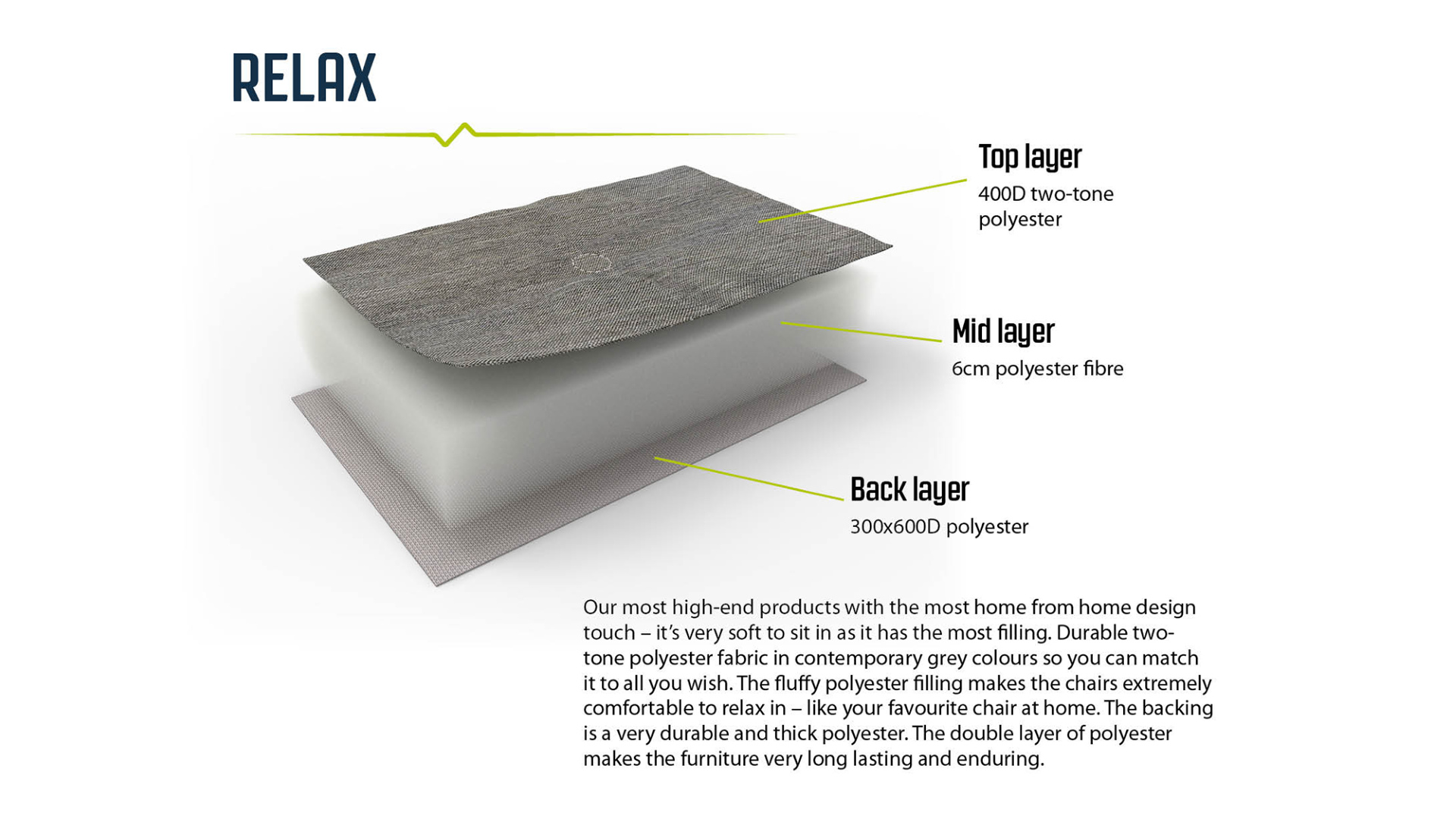 | Material: | Oberstoff: zweifarbiges 400D Polyester; Mittelschicht 6 cm Polyesterfaser, rückseitige Schicht 300 x 600D Polyester; Gestell: pulverbeschichteter Stahl |