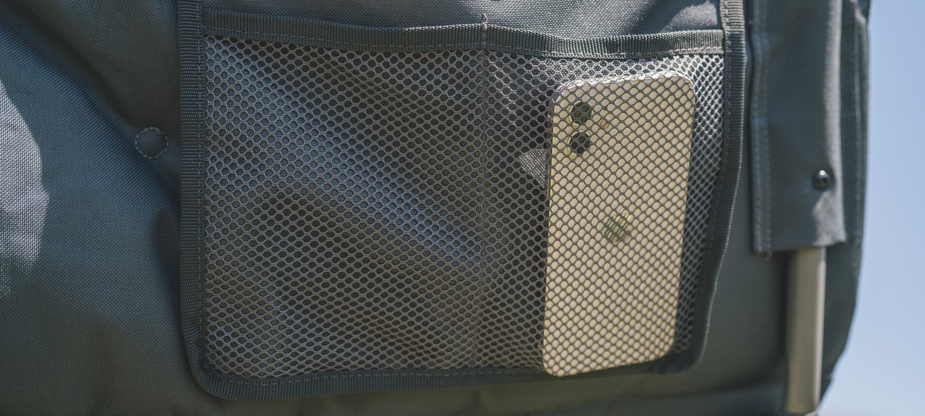 geben Stabilität, auch speziell auf unebenen Böden. Auf der Seite sind Armlehnen angebracht und damit auch das Handy oder andere Kleinigkeiten ihren Platz finden, befindet sich auf der Seite einer Armlehne eine Tasche aus Mesh-Stoff.