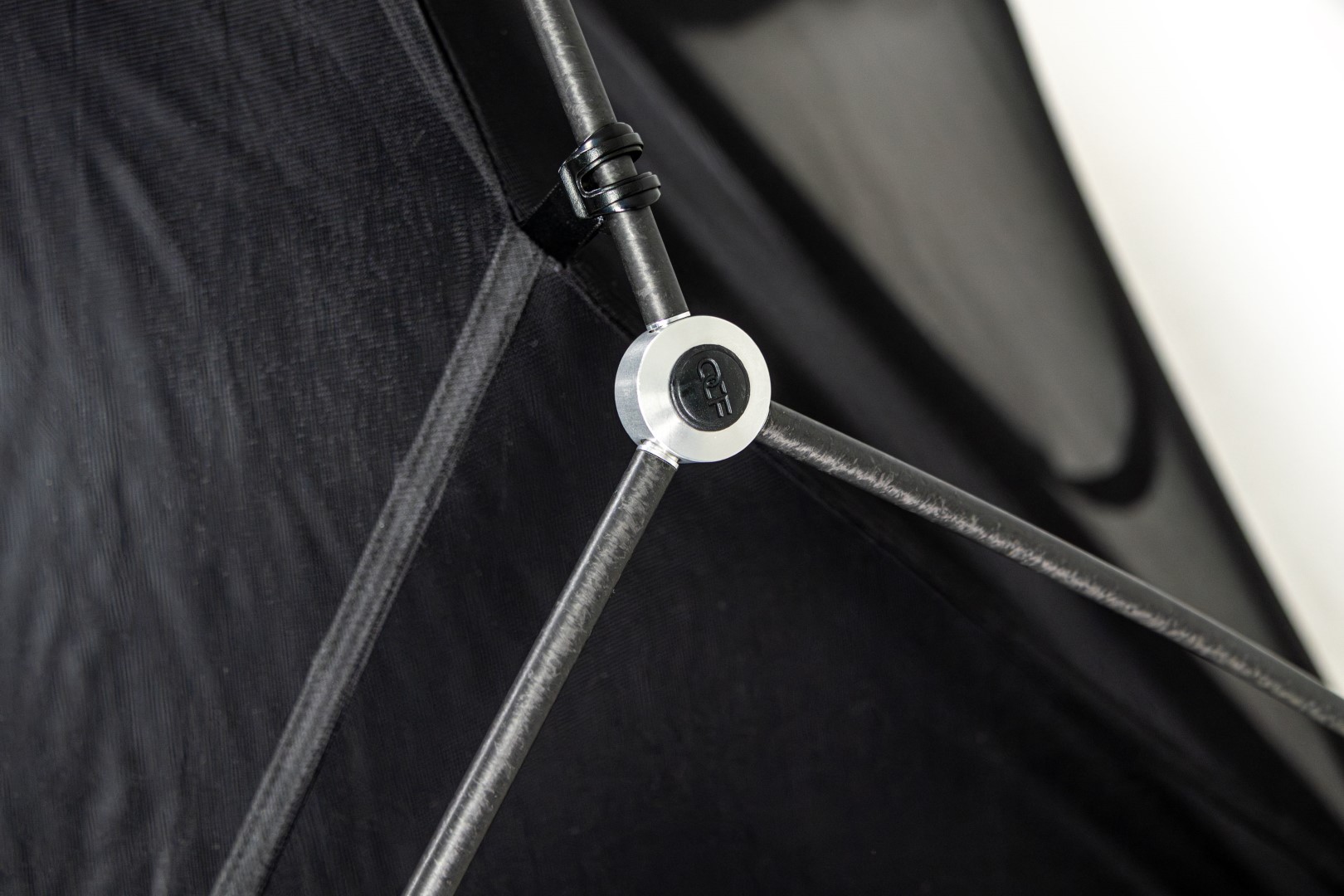 - Zwei Aluminium-Knotenpunkte am Gestänge sorgen für eine hohe Windstabilität, an den Endpunkten der Firststange befindet sich jeweils ein Stoffköcher, der zur Aufnahme eines Trekkingstocks dient. Hierdurch lässt sich die Windstabilität des Zeltes weiter verbessern.