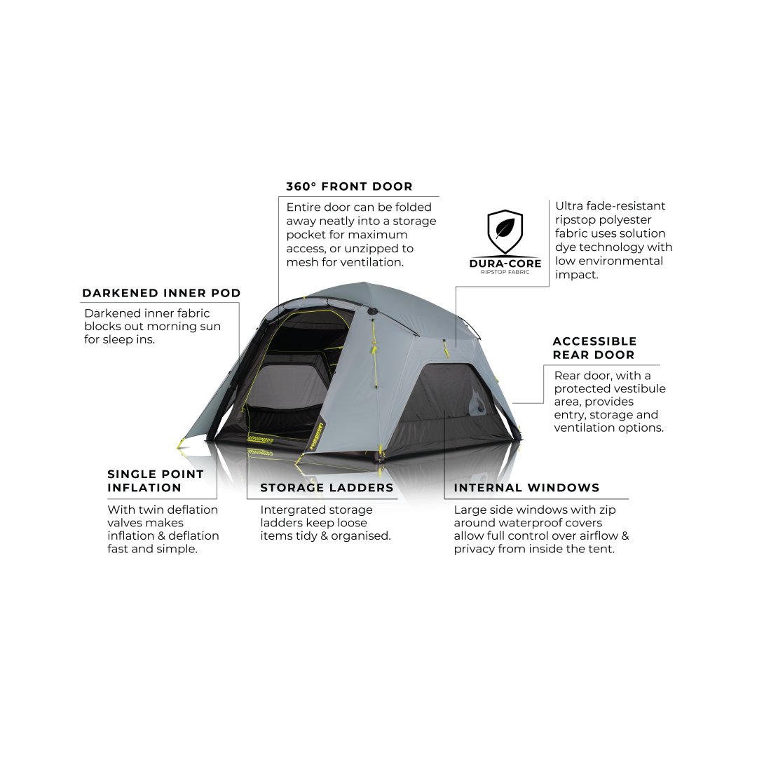 Der Aufbau gelingt mühelos – das vormontierte Außenzelt wird einfach aufgepumpt, die mitgelieferte Pumpe lässt sich platzsparend im Packsack verstauen. Das hochwertige Dura-Core Polyester mit moderner Solution-Dye-Technologie ist extrem farbbeständig, feuerhemmend sowie PFOA- und PFOS-frei. Große, geschützte Fenster und Türen ermöglichen eine vollständig kontrollierbare Belüftung für maximalen Komfort. Die abgedunkelte Innenkabine sorgt für erholsamen Schlaf, während integrierte Stauraumlösungen Ordnung ins Zelt bringen. Zwei gegenüberliegende Eingänge mit geschütztem Vorbereich bieten flexible Zugangs- und Staumöglichkeiten. Dank seines besonders leichten Gewichtes (nur 10,8 kg!) und dem kompakten Packmaß ist das Aerospeed 6 eines der mobilsten Air-Zelte seiner Klasse und lässt sich bequem transportieren – ideal für Familien, Roadtrips und alle, die maximale Freiheit beim Camping suchen. Für das Aerospeed 6 gibt es auch eine reiche Auswahl an optionalen Ergänzungen, wie z.B. einen Hitzeschutz (Roof Cover), zusätzliche Seitenwände, eine robuste Zeltunterlage und eine speziellen Anbindung an einen Evobase Shelter.