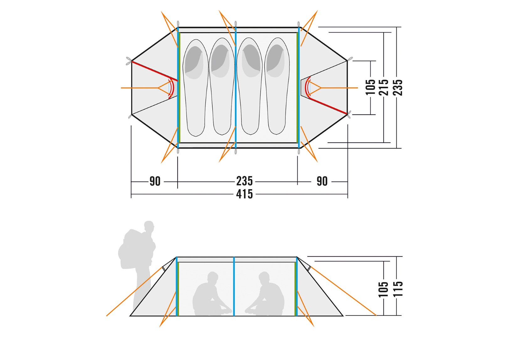 | Maße: | Außenzelt: 415 x 235 x 115 cm; Innenzelt: 235 x 215 x 105 cm |
