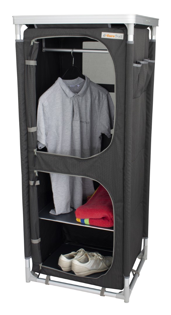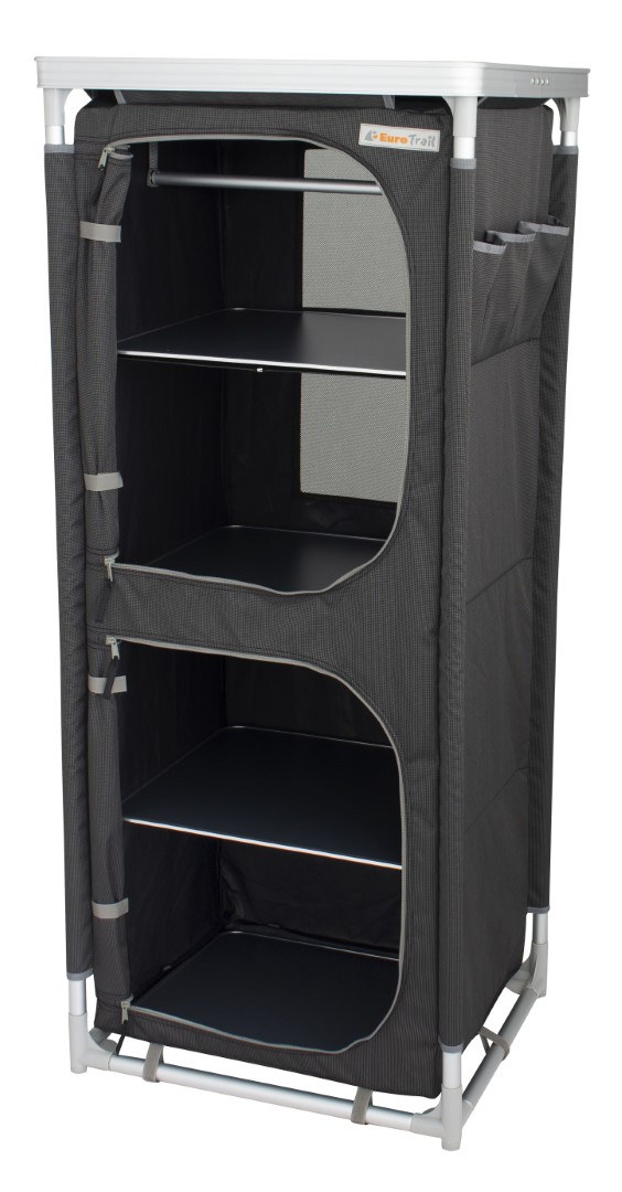 Praktischer Camping Schrank mit Kleiderstange – hoch, geräumig und funktional ist er die perfekte Lösung für eine organisierte Aufbewahrung beim Camping.