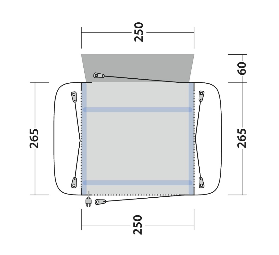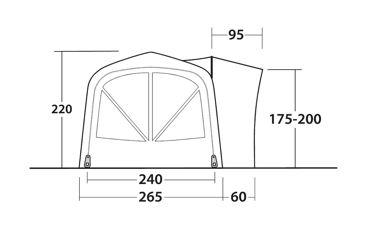 | Maße: | 265 (+60 Schleuse) x 250(+2x70 Vordach) x 220 cm / Anbauhöhe 175-200 cm / Dach-Befestigungslänge 250cm / Keder-Durchmesser 7/5mm |