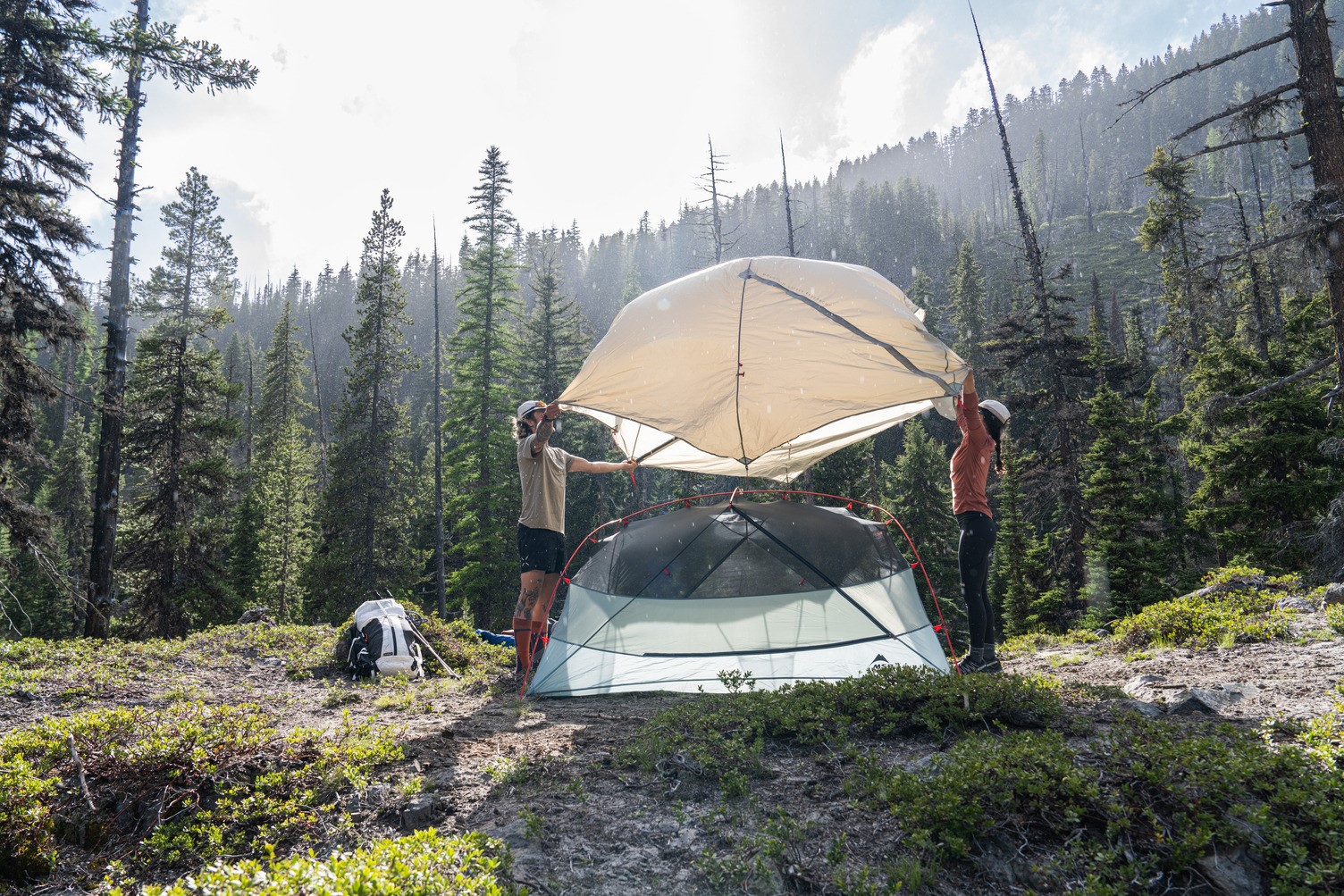 | Außenzeltmaterial: | 20D Ripstop-Nylon, Solution-dyed, PU- und PFAS-freie Silikonbeschichtung, 1.200 mm WS |