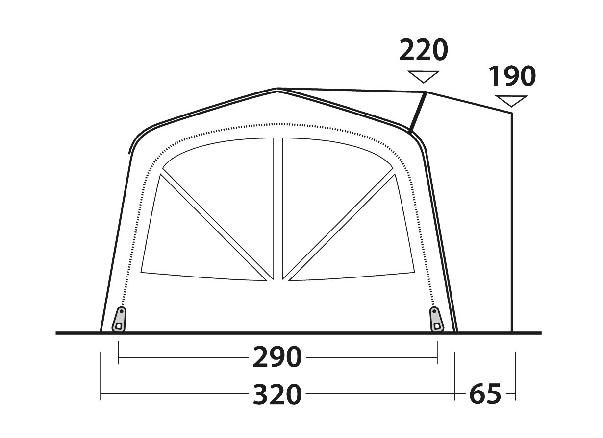 | Maße: | 570 x 320 (+65 Schleuse) x 220 cm / Anbauhöhe 175-200 cm / Keder-Durchmesser 7/5mm, Dach-Befestigungslänge 250cm |