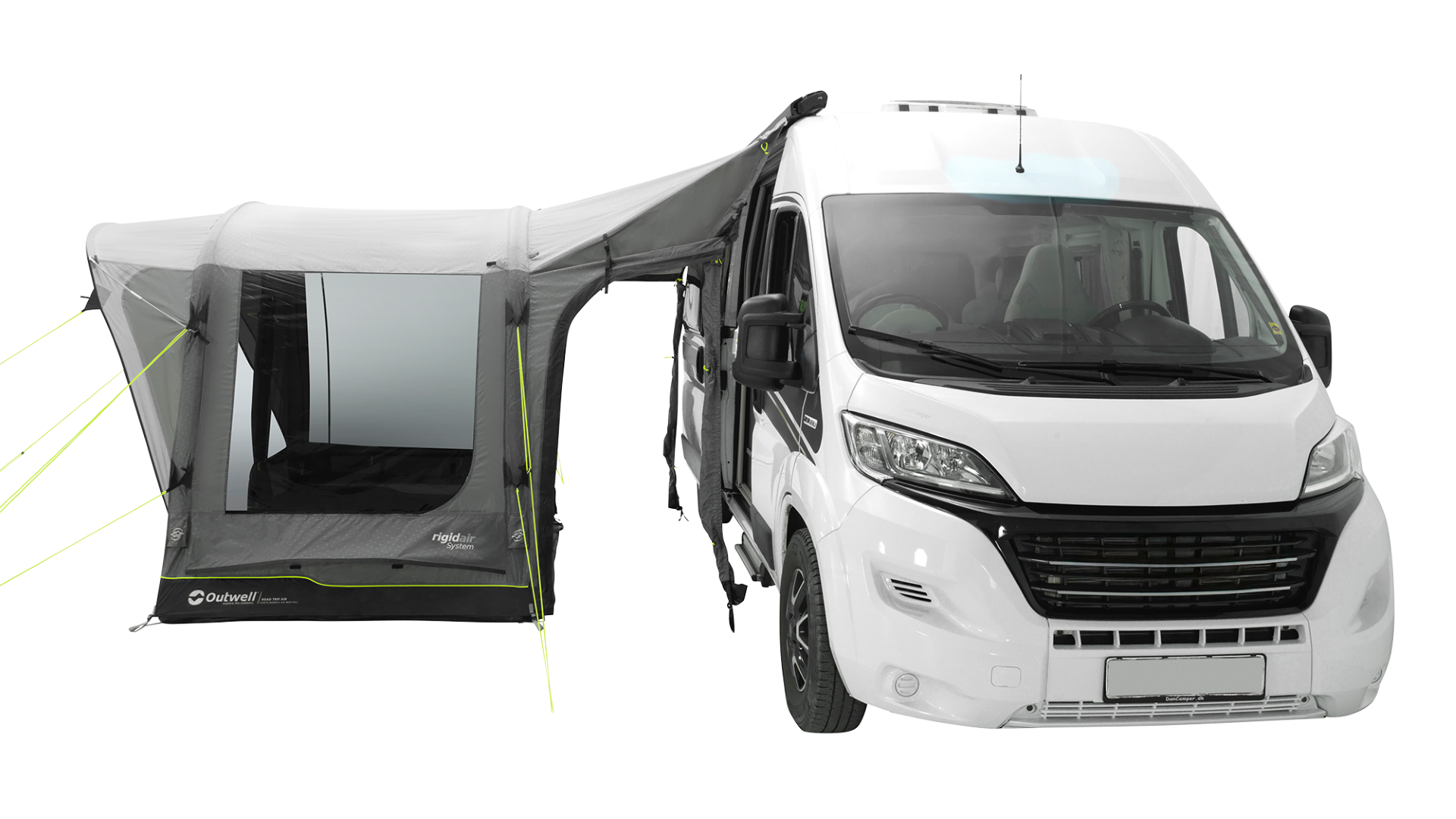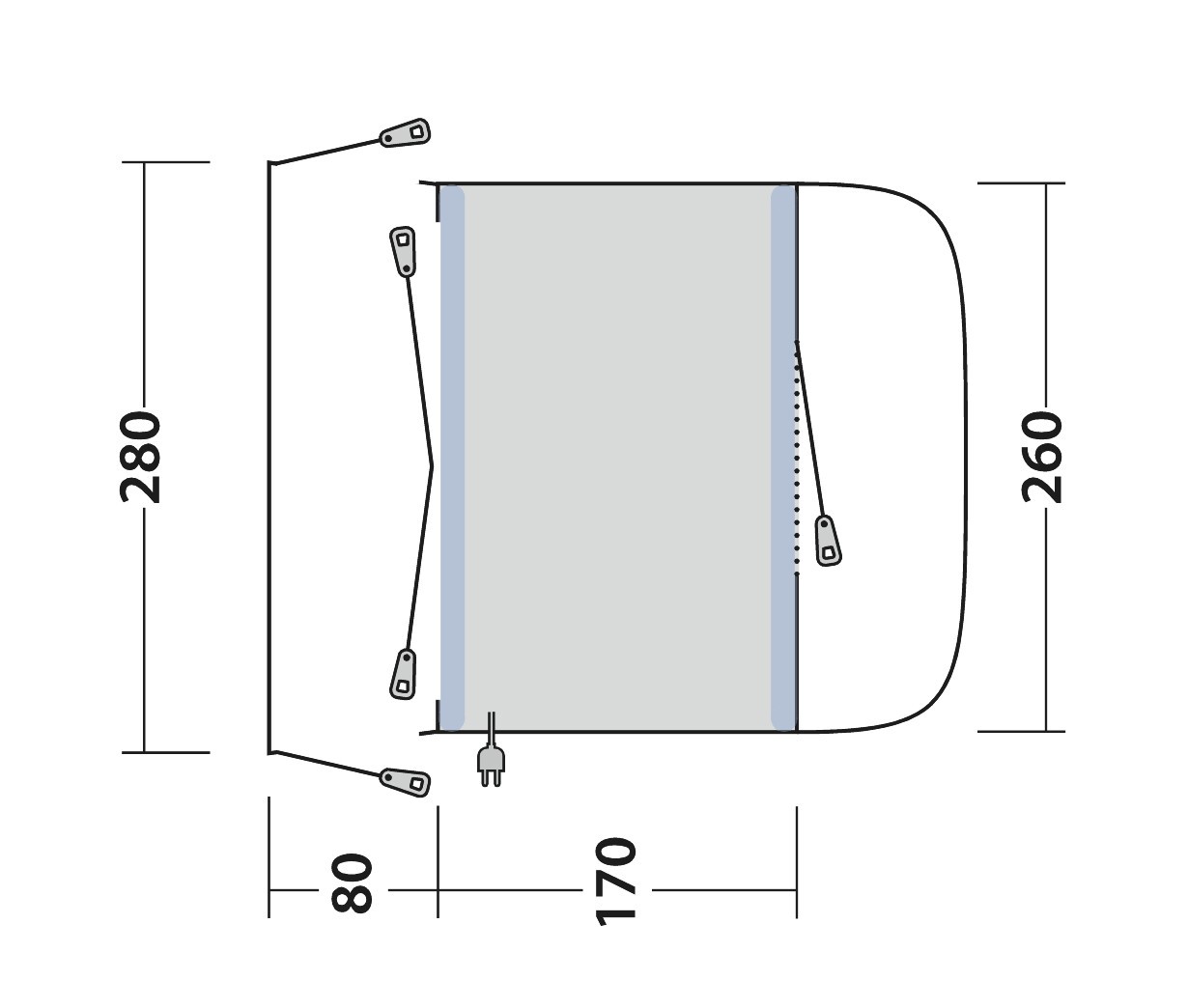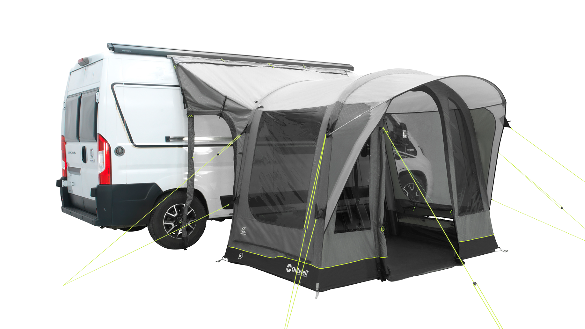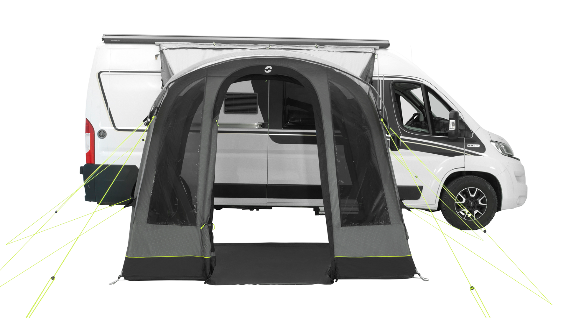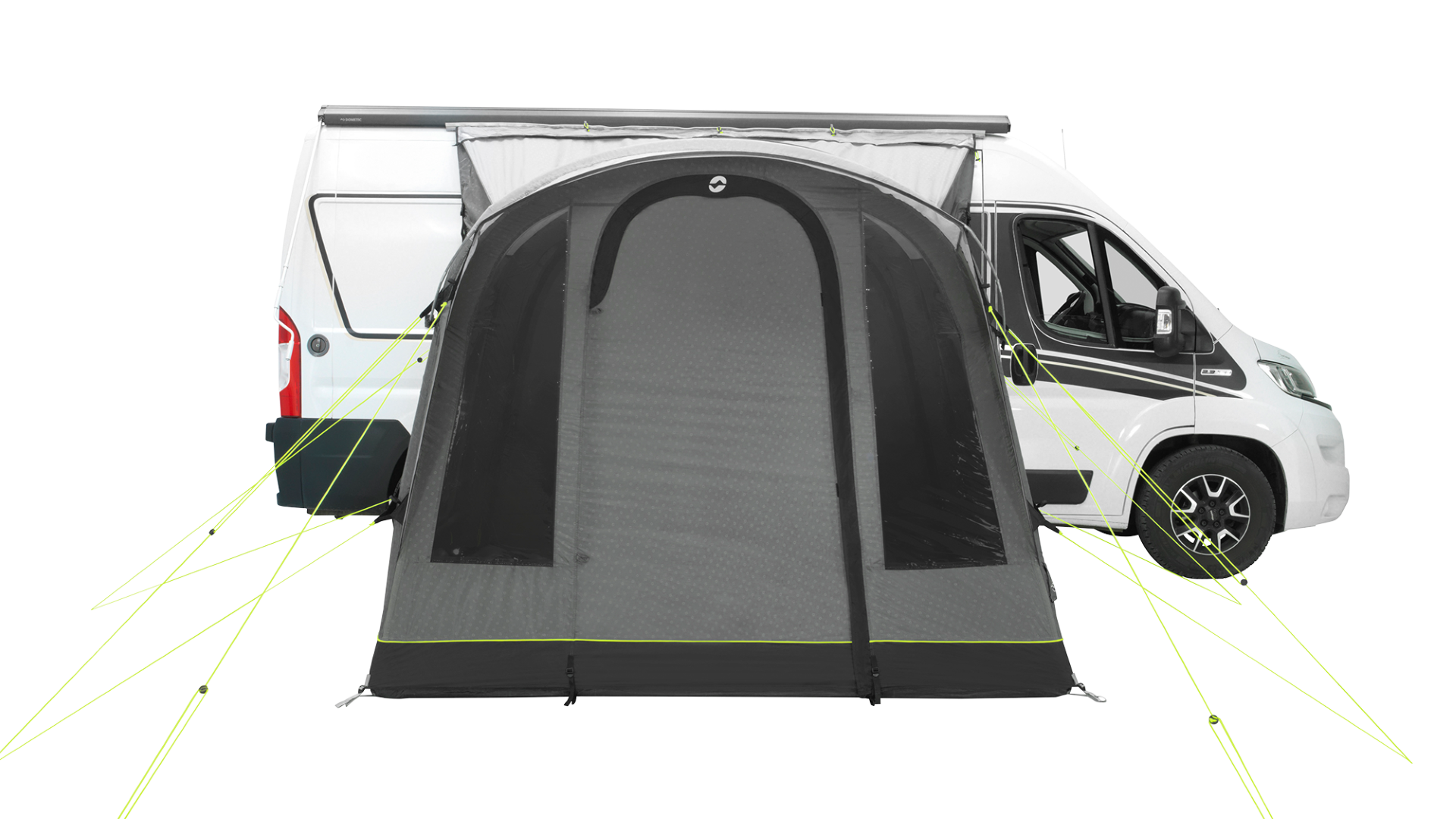 Das Santa Monica Air Mid/Tall ist das perfekte Drive-Away-Vorzelt für alle, die mit höheren Fahrzeugen wie Fiat Ducato, VW Crafter, Mercedes Sprinter oder ähnlichen Modellen unterwegs sind. Die Ausmaße dieses Anbauzeltes sind kompakt und so abgestimmt, dass es einen feinen zusätzlichen Wohnraum, aber auch eine praktische Schlafmöglichkeit für Paare, kleine Familien oder Alleinreisende bietet. Die großen getönten Folienfenster lassen angenehm weiches Licht ins Zeltinnere und sorgen für eine gute Atmosphäre. Der Zugang über die beiden seitlichen Eingänge in der Link Acess Zone ist außerordentlich bequem und flexibel. Die Vordertüre ist mit einer D-Türe aus Stoff mit einem großen Moskitopanel ausgestattet. Das Santa Monica Air Mid/Tall kann natürlich komplett verschlossen werden und ist freistehend – somit steht es auch ohne Fahrzeug stabil. Das Outtex® 3000 Select Polyester ist UV-stabil und hält auch bei längerem Regen dicht.