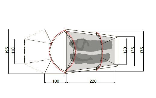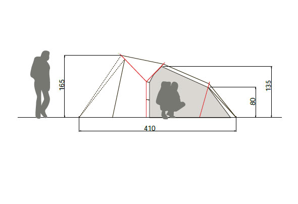 | Maße: | Außenzelt: 410 x 135-195 x 165 cm / Innenzelt: 220 x 175-120 x 135 - 80 cm / Apside: 1 x 180 cm |