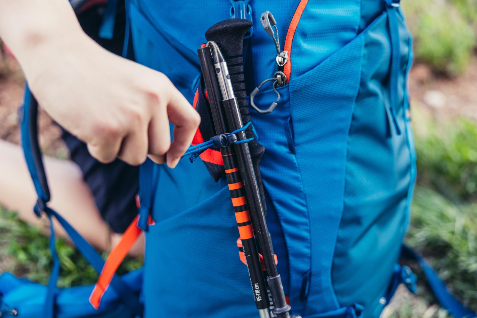 - Zwei seitliche Stretch-Netztaschen mit Durchgriff zur Kompressionsjustierung.